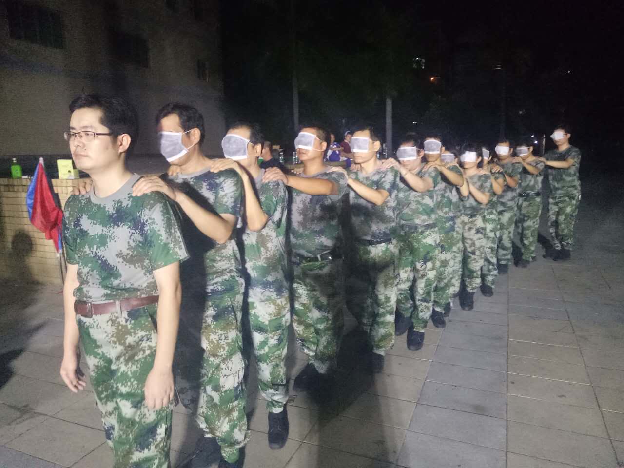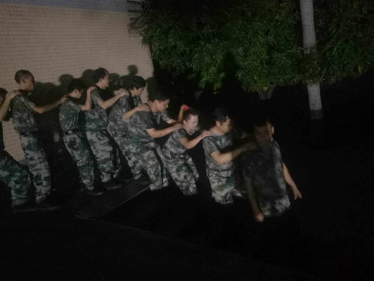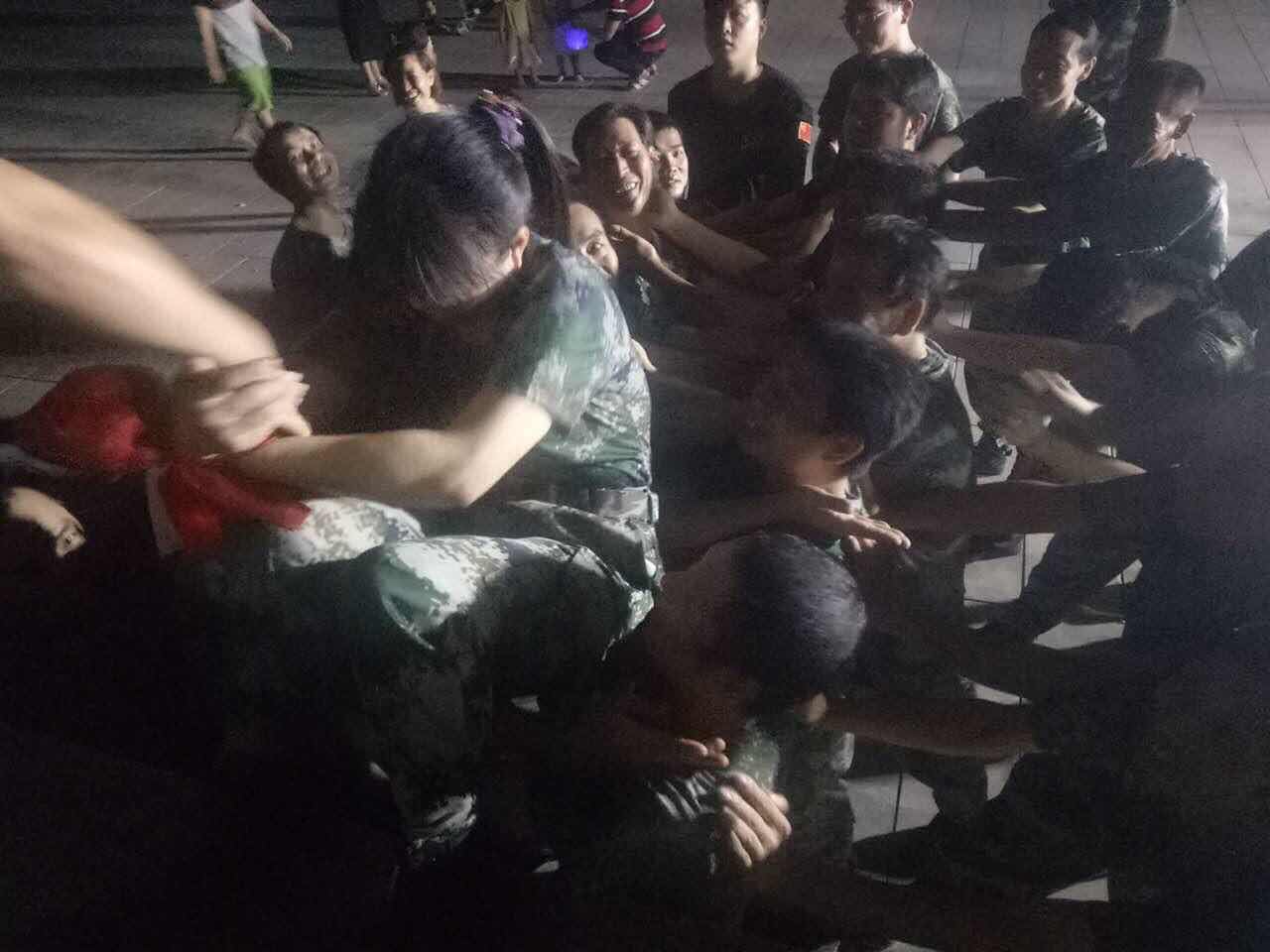 每一位從背摔架上勇敢倒下的隊員下來后要擁抱每一位隊員,每一位隊員也要給倒下的隊員鼓勵